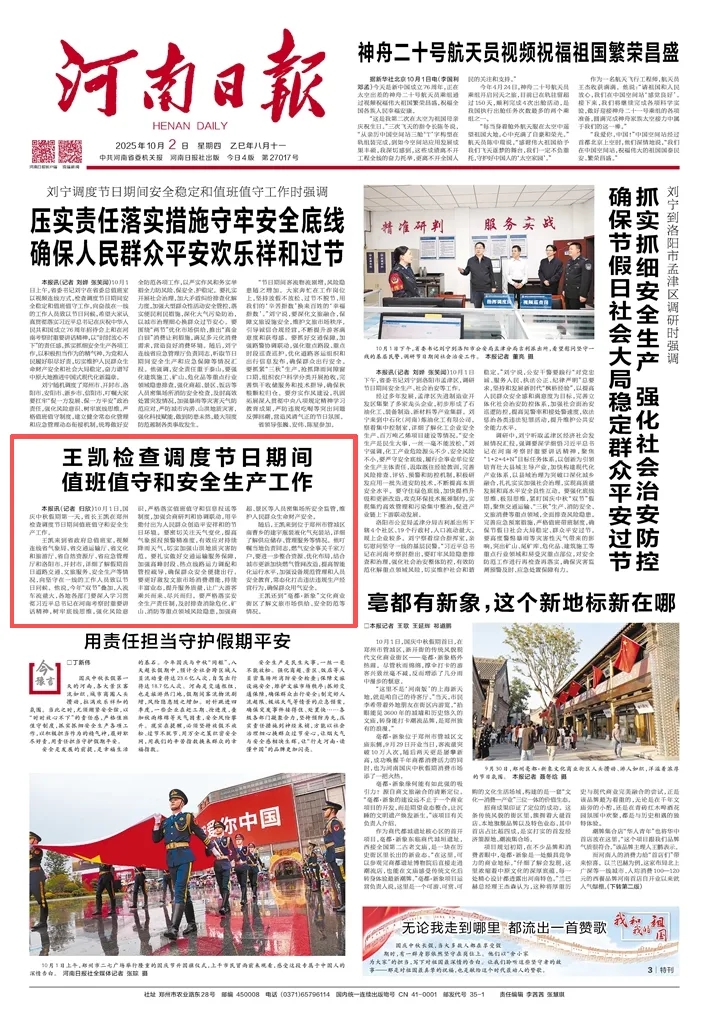 王凱來到省政府總值班室,視頻連線省氣象局、省交通運輸廳、省文化和旅游廳、省自然資源廳、省應(yīng)急管理廳和洛陽市、開封市,詳細了解假期首日道路交通、文旅服務(wù)、安全生產(chǎn)等情況,向堅守在一線的工作人員致以節(jié)日問候。他說,今年“雙節(jié)”疊加,人流車流量大,各地各部門要深入學(xué)習(xí)貫徹習(xí)近平總書記在河南考察時重要講話精神,樹牢底線思維,強化風險意識,嚴格落實值班值守和信息報送等制度,加強會商研判和協(xié)調(diào)聯(lián)動,用辛勤付出為人民群眾創(chuàng)造平安祥和的節(jié)日環(huán)境。要密切關(guān)注天氣變化,提高氣象預(yù)報預(yù)警精準度,有效應(yīng)對持續(xù)降雨天氣,切實加強山洪地質(zhì)災(zāi)害防范。要扎實做好交通運輸服務(wù)保障,加強高峰時段、熱點線路運力調(diào)配和管控疏導(dǎo),確保群眾安全便捷出行。要更好激發(fā)文旅市場消費潛能,持續(xù)豐富業(yè)態(tài),提升服務(wù)質(zhì)量,讓廣大游客乘興而來、盡興而歸。要嚴格落實安全生產(chǎn)責任制,及時排查消除危化、礦山、消防等重點領(lǐng)域風險隱患,加強商超、景區(qū)等人員密集場所安全監(jiān)管,維護人民群眾生命財產(chǎn)安全。