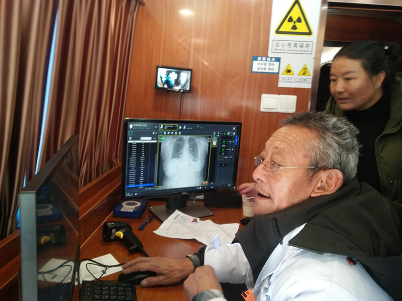 圖為我院放射科主任次仁加錯(cuò)主任為患者進(jìn)行胸片拍攝準(zhǔn)備工作。